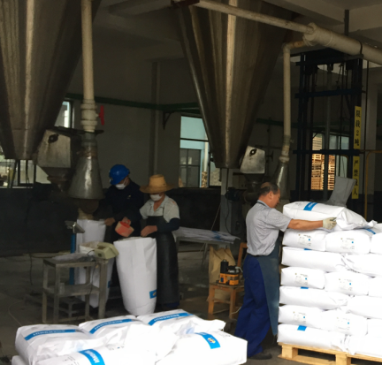 目前各染料生產企業(yè),在成品包裝過程中,基本上使用的是袋包裝或箱裝兩種規(guī)格,袋包裝形式為:編織袋內襯PE塑料袋。箱裝形式為:紙箱內襯PE塑料袋。目前企業(yè)普遍使用人工進行稱重包裝,從放料口開始接料,到放完后進行復秤及后道的扎袋、封箱(編織袋縫口)、堆碼等,各個工序均有人工處理完成,一般情況下,按照簡易化的生產流程,一個放料口的生產班組約為3~5人(見圖一)。一般情況下至少有兩個班組在生產(如龍盛、閏土、吉華等這些行業(yè)內大企業(yè),基本上極少有10個以上的班組在生產)。企業(yè)的用工量極大,與此同時,當前的包裝工人普遍年齡在四五十歲以上,對于環(huán)境差、有污染的生產場所(見圖二),年輕人員基本上是趨之若鶩,因此隨著企業(yè)招工難度大、用工成本的普遍上漲以及企業(yè)對成品稱重包裝精度與合格率的不斷提升,一體化機械智能包裝已經是一種趨勢所向,同時國家也在大力整理各項化工企業(yè)的污染問題,因此,一種智能化的機械包裝整體工程設備即將會使得各染料化工企業(yè)作為技術整改的標準所需。