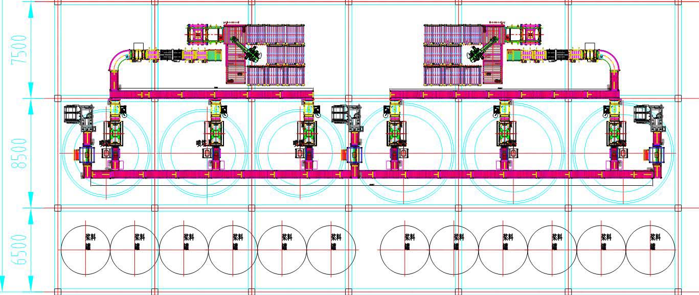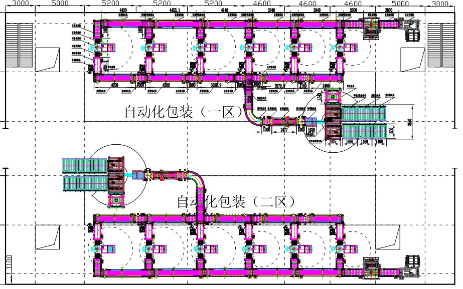 再如一染料生產企業(yè)(如下圖),一包裝車間有12套拼混設備,混拼后的染料需要現(xiàn)實無人化的生產流程,同時需要考慮到設備的兼容性以及滿足用戶生產流程,因而設計成單邊六合一的包裝碼垛生產線。