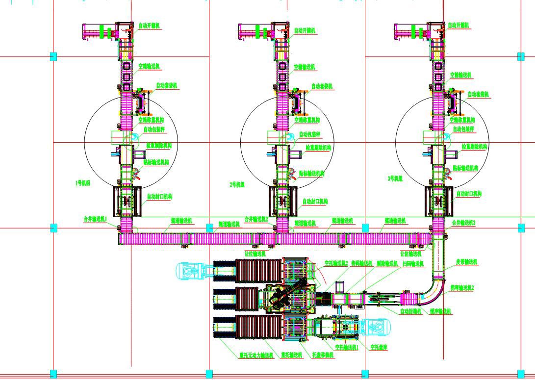 如一染料生產企業(yè),有6支噴塔組成的生產車間,想要實現(xiàn)經濟的無人化生產,就需要在設計中充分考慮各設備的兼容性,同時還要終盤考慮用戶的現(xiàn)場布置情況,只有這樣才可以設計組合出一套機械包裝工程(如下圖九)。
